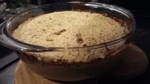 Place into the preheated oven for approximately 45 minutes, until the fruit bubbles and the topping is a golden brown.